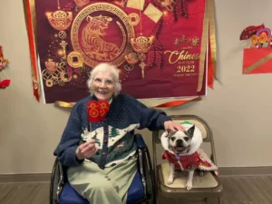 Cocoa, the fun pet therapy pooch at Glens Falls Center in Glens Falls, New York, greeted all of the staff and residents for the Chinese New Year celebration on February 1, 2022.