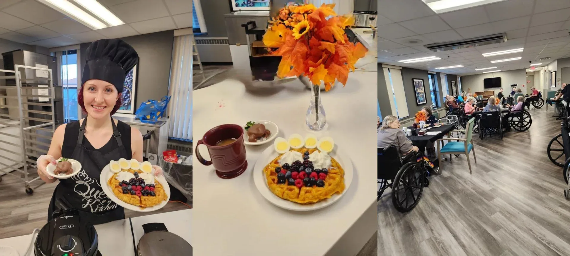 As a special way for the season of giving thanks before the Thanksgiving holiday, residents at Corning Center here in Corning were treated to a special breakfast that was personally cooked by the facility’s Registered Dietician Cecile Grapevine. The residents fully loved the pumpkin-spiced waffles with berries and a delicious whipped topping. Centers Health Care’s Corporate Director of Food and Nutrition, Tonya Werkman, said that Cecile’s heart for her residents came out with this heartfelt breakfast.