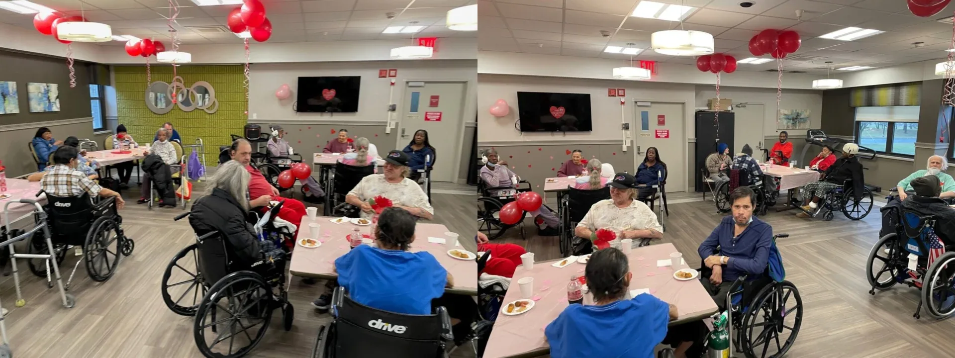 On Valentine’s Day, love was felt throughout Ellicott Center as the recreation department at the 160-bed skilled nursing facility in downtown Buffalo had a big Valentine’s Day lunch. Residents had a great time eating tasty mini tacos, mozzarella sticks, Swedish meatballs, pigs in a blanket, fruit punch, and a heart-shaped cake for dessert.
