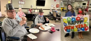 New Year’s Eve at Glens Falls Center was anything but boring as the Recreation team, headed by Marijo Natale, by welcoming 2022 with their residents, many had family members and some of the kids of the staff who came to the Glens Falls facility to celebrate. The Recreation team looked back at 2021 with such fond memories of the year by showing slide show to the residents and staff whereby “awwwws” and laughs were heard throughout the dining room. Residents celebrated with pizza, soda and sparking cider.