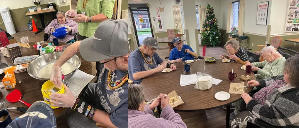 On April 26, Slate Valley Center in Granville recognized "National South Dakota Day" by celebrating the 40th state by making that state’s famous dessert “kuchen”. Kuchen, which is German for “cake” is a very tasty pastry dessert that came to the Badlands in the 1880s from German settlers, originally made by Germans and German Jews in Europe at that time. Typically, kuchen is made with a sweet dough and contains a fruit or custard filling and there are about as many different recipes and styles of kuchen as there are people who make it. Back home in Granville, along with helping to make the dish, residents also learned facts about South Dakota and the history behind "kuchen". The residents worked hard baking it and then relaxed by eating it. They did a great job.
