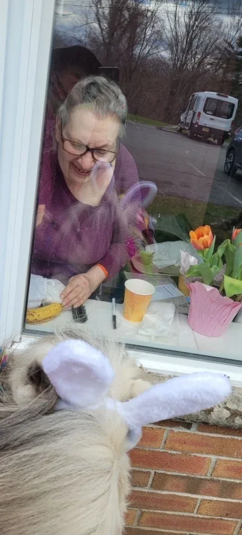 On April 12, 2022, Troy Center on Marvin Avenue in Troy, New York, received a window visit by a pony named Frost, a beautiful nine-year-old Shetland from Kasey’s Cast-a-Ways in Port Jervis, New York. Here, resident Deana Koepp admires Frost through her window. Still, indoor animal visits have not been cleared by New York State’s Department of Health.