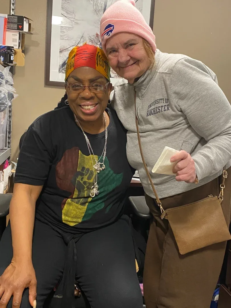 [PHOTO: Ms. Hibbert, left, with Shirley King in her great pink Bills hat.]