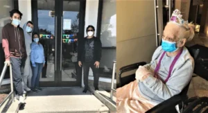 In May of 2020, her family came, but sang happy birthday outside of the front doors of the building due to COVID-19 state and CDC restrictions. Now with visitation easing more and more, her family was there in person this time and wore face shields.
